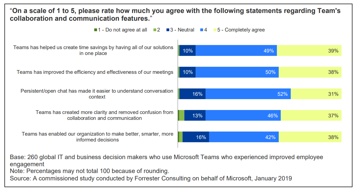 Il documento indica anche importanti vantaggi derivanti dall’integrazione in Microsoft Teams per i decision-maker delle organizzazioni: l’ambiente di lavoro integrato con strumenti di produttività, collaborazione e comunicazione può portare a una riduzione di oltre il 17% del time-to-decision.